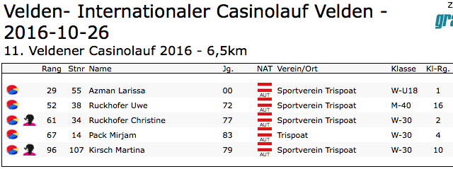 Die trispoat-Damen und Herren haben beim heutigen Casinolauf in Velden erneut die Straße zum Glühen gebracht. Larissa Azman holt sich als schnellste Dame den Tagessieg! Sie siegt souverän mit über einer halben Minute Vorsprung vor der zweitplatzierten vom LAC.